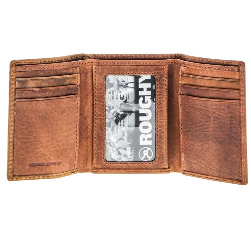 This Roughy trifold wallet features rugged oil tanned leather , detailed with heat branded roughy logo & triple stitched overlay