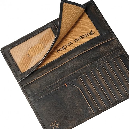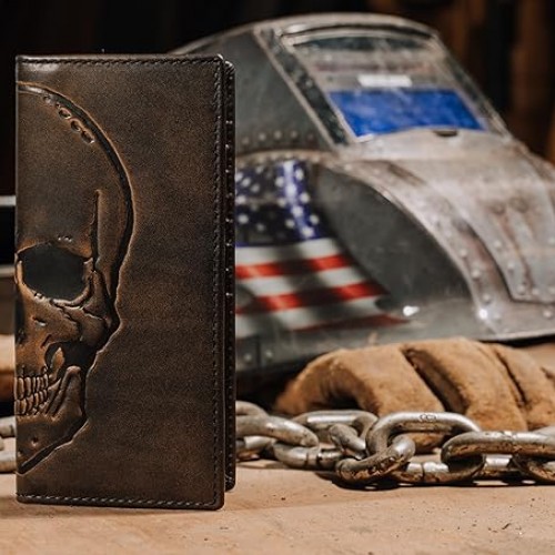 - LONG BIFOLD FEATURES: Built to organize your essentials, the Skull Long Bifold Wallet includes 9 card slots, 4 full-length cash or receipt pockets, and a designated ID window with a thumbhole cut-out for easy license removal. The tan canvas lining adds rugged contrast to the burnished leather exterior, giving this rodeo long leather wallet a modern finish. DIMENSIONS: 3.5″ L x 6.9″ H