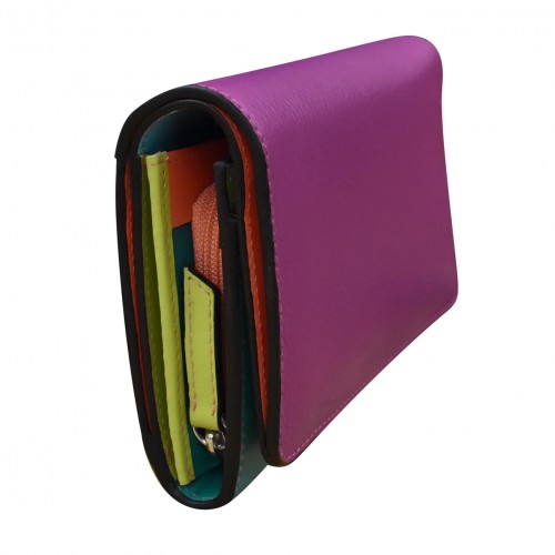 Smooth leather wallet with RFID blocking lining. Flap wallet with snap button closure and back zip pocket. Inside deep currency pocket, 10 credit card slots, zip and three slip pockets.