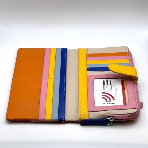 Women’s ILI, Double Zip Smart Phone Wallet. Genuine leather. zip around phone pocket and tab closure Exterior- back zip pocket Interior- I.D. window 14 credit card slots and bill pockets