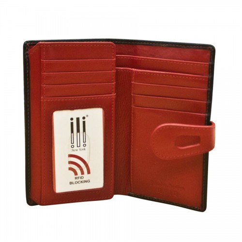Made from soft genuine leather with RFID Blocking (Radio Frequency ID). Back zip pocket. Snap compartment with slip and bill fold pockets. 14 credit card slots, ID window.