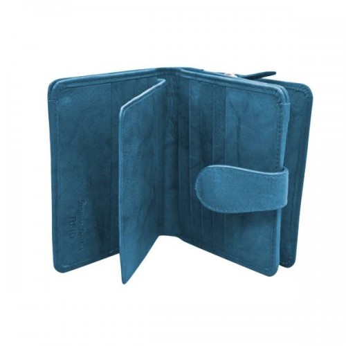 Genuine leather wallet with RFID blocking lining, tab closure and zip pocket.