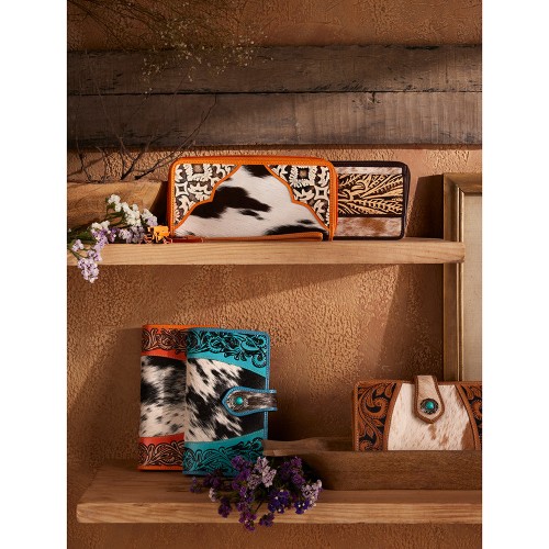 The Isleta Wallet blends artisanal craftsmanship with Southwest charm. This leather zipper wallet’s front showcases a striking hair-on-hide accent paired with an embossed leather panel in a timeless pattern. The interior offers ample slots and compartments, including a secure inside zipper pocket and RFID protection for peace of mind. A wrap-around zipper keeps everything secure, while the detachable wristlet adds convenience. This rodeo wallet is a perfect blend of country elegance and everyday functionality!