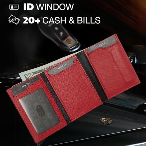- 【 RFID Blocking Security 】 In today’s world, identity theft is a growing concern. Jenoss comes equipped with cutting-edge RFID-blocking technology, creating a secure barrier around your credit cards, IDs license, and other sensitive information, ensuring your data remains safe from electronic pickpocketing. This protective feature makes it a must-have men’s wallet for the modern mens.