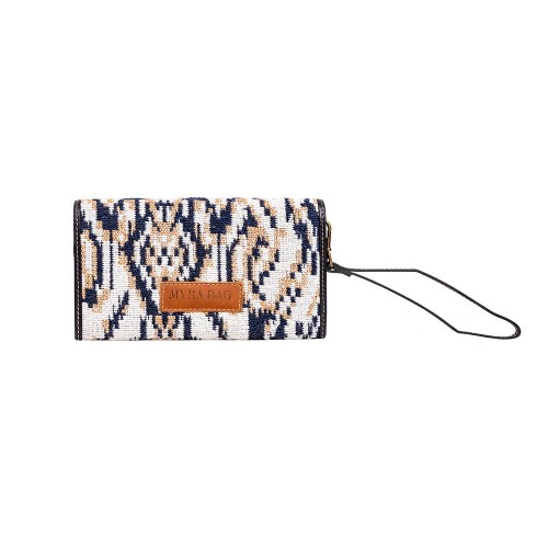 This enticing wallet features beautiful upcycled woven canvas in the gorgeous pattern known in this collection. Luxurious ebony leather trims the wallet, including the front buckle. Interior features spacious sections, including a zippered pocket. Snap-close front flap. A gorgeous design that you’ll love!