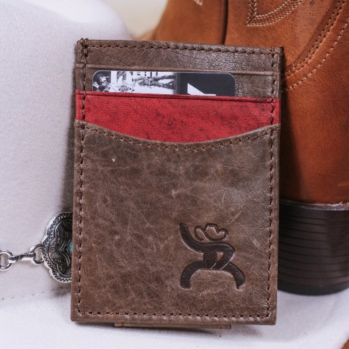 This Roughy money clip wallet features brown leather, detailed with red leather accent pocket.