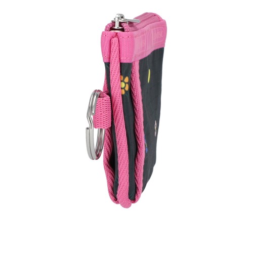 Zip main closure, Exterior front and back open pockets, Metal key ring on side