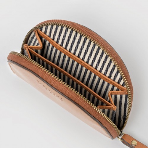 Her compact semi-circle half-moon design holds enough space for cards – she opens to reveal two note compartments and two slots for cards but her top zipper fastening holds your coins as well. Just the right size and shape for all your daily needs.
