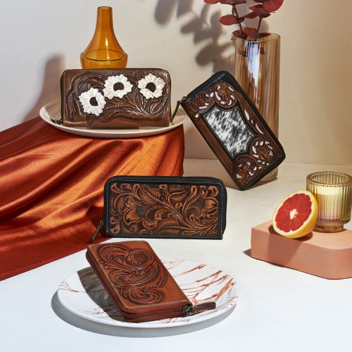For those who love a purse they can cherish every day, this hand tooled leather wallet is the perfect companion. Designed for both style and practicality, it features a timeless Western design, an RFID protector, and a well-organized interior with a secure zipper pocket and card compartments. Its versatile look pairs effortlessly with any outfit, making it an ideal Myra wallet choice for the cowgirl who sticks to her favorites!