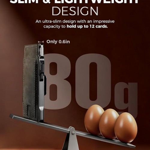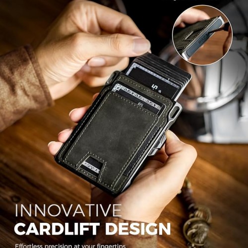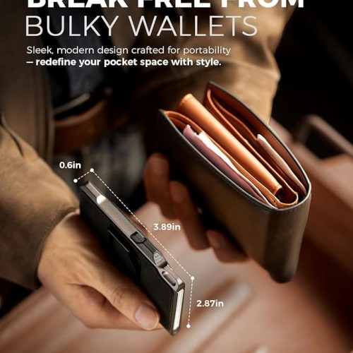 - Accessible Design: This premium wallet combines sleek design with practicality. Its one-touch eject mechanism elegantly displays cards in a layered layout for instant access, while the slim profile eliminates bulk without compromising sophistication. A bottom card hole ensures no card gets stuck, and the spacious money clip easily holds over 10 bills. Perfectly blending style and utility, this wallet is a refined accessory for the modern gentleman.