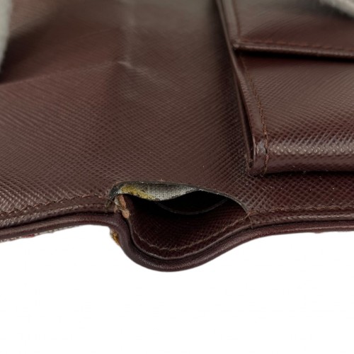 Louis Vuitton Porte Billets Wallet from Winter 2002 collection. Wallet features woven monogram exterior, burgundy leather interior, three card slots, snap coin pocket, and split bill pocket. Wallet is in good condition with signs of wear with yellowing of edges, lining split in one area (pictured), and lightened spots on back of wallet (pictured). Certificate of authenticity, courtesy of Entrupy, included. Made in France.