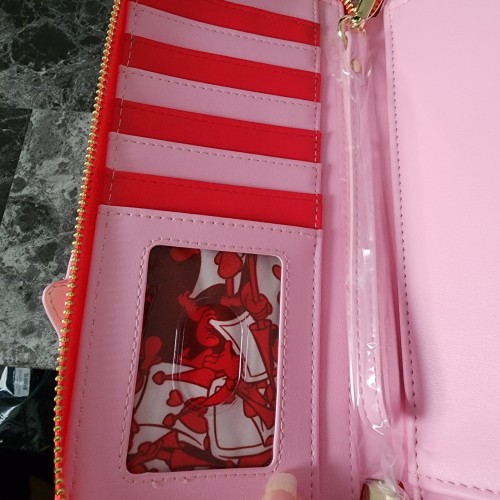 Awesome Loungefly Disney Ace of Hearts from Alice and Wonderland wallet. It has a all around zipper closure with slots for credit cards and a ID slot. There is a zipper compartment on the back for coins and a large slot for bills. Great for everyday use