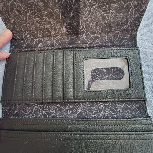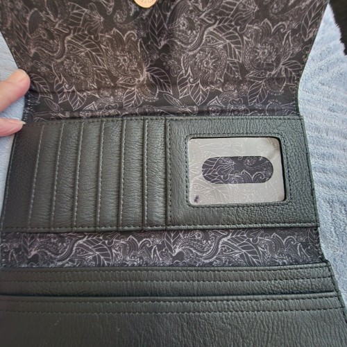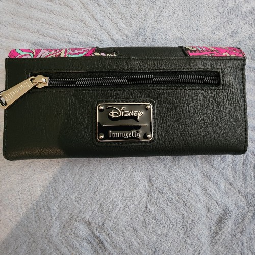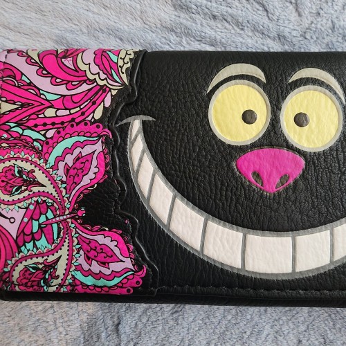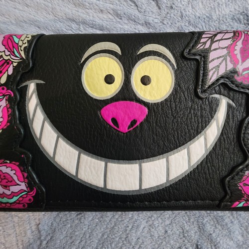 Awesome Loungefly Disney Alice in Wonderland Cheshire Cat wallet. It has a snap closure with slots for credit cards and an ID slot. This wallet is a tri-fold and able to hold alot of stuff. Great for everyday use.