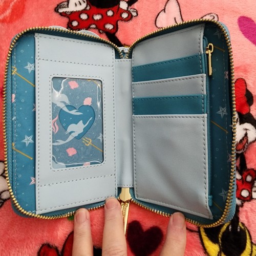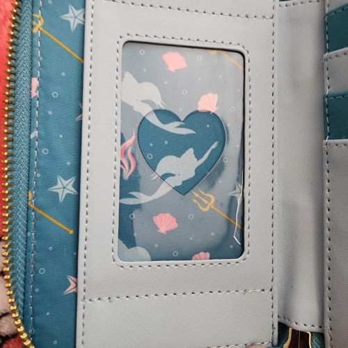 Awesome Loungefly Disney Little Mermaid’s Ariel and Eric Wedding Cake Wallet. It has a zipper closure with slots for credit cards and an ID slot. Great gift for your love one.