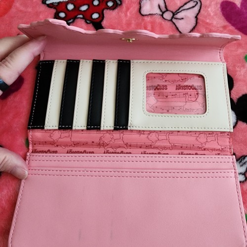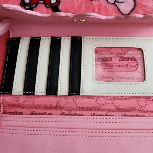 Awesome Loungefly Disney Aristocats Wallet. It has a snap closure with slots for credit cards and an ID slot. There is a zipper compartment on the back for coins and bills and a large regular slot for just bills. Great gift for a loved one.