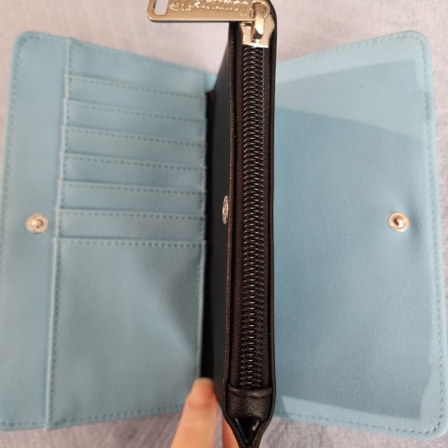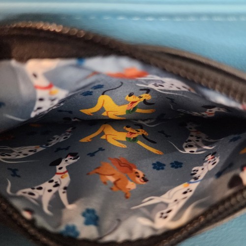 Awesome Loungefly Disney Dogs 101 Dalmatian, Lady, and Pluto Wallet. It has a double snap closure with a middle zipper pocket. There are slots for credit cards on both sides, an ID slot, and a large bill slot. There is also a zipper compartment on the back of the wallet. This wallet can hold a lot and is great for every day.