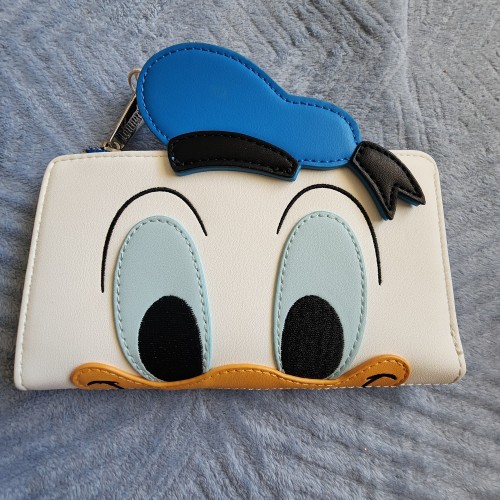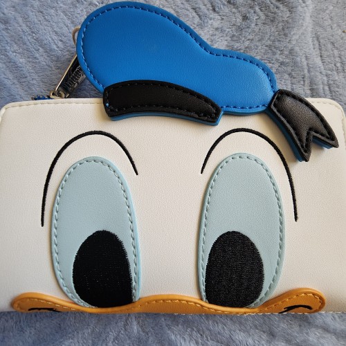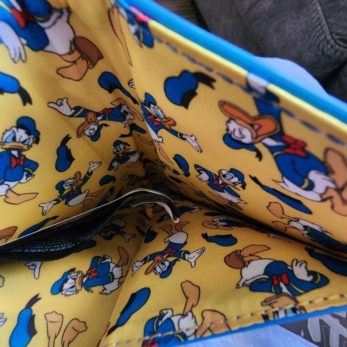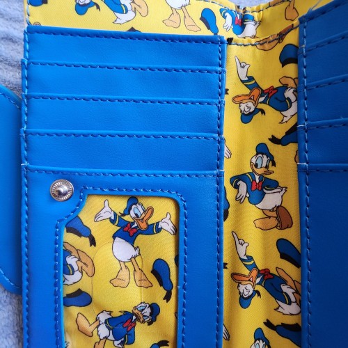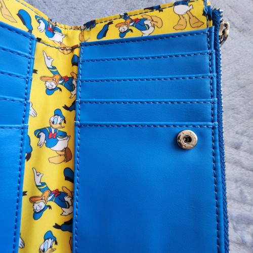 Loungefly Disney Donald Duck Cosplay Wallet. With a snap closure, this wallet includes card slots, a clear ID sleeve, a bills compartment, and a perfect for your next adventure. Great for everyday use.
