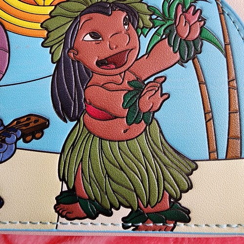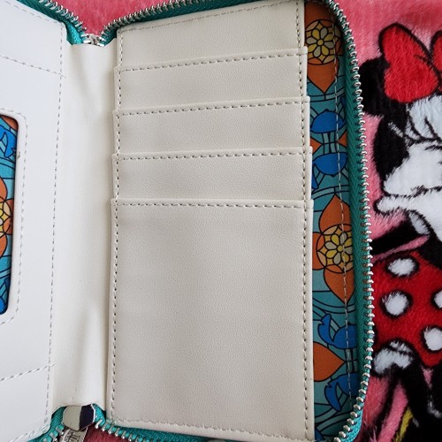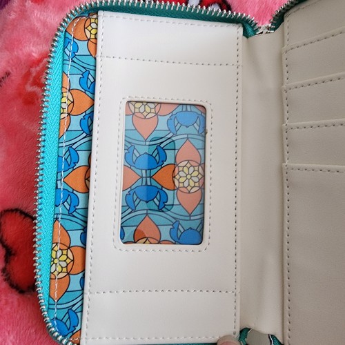 Awesome Loungefly Disney Lilo and Stitch Stained Glass Wallet. Stitch is playing the ukulele while Lilo is doing the hula. It has slots for credit cards and an ID slot. There is a small slot you can put bills in. This is a great gift for your loved one.