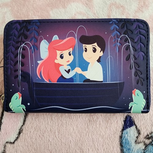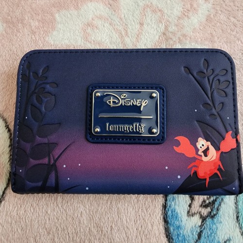 Awesome Loungefly Disney Little Mermaid Kiss the Girl Wallet. Ariel and Eric in the biggest scene in the Little Mermaid movie now in a wallet. It has slots for credit cards and an ID slot. There is a small slot you can put bills in. This is a great gift for your loved one.