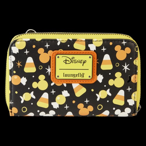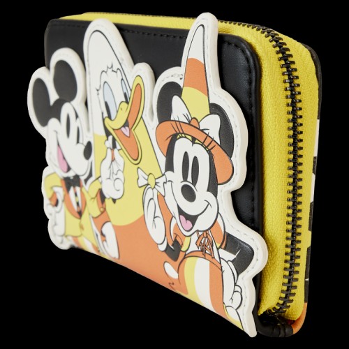On the front, Mickey Mouse is all decked out in a candy corn-striped suit. Minnie Mouse looks bewitching in her costume, and Donald Duck looks irresistible, dressed as a piece of candy corn. On the back, wrapped sweets, candy corn pieces, and Mickey Mouse ears, in candy corn colors, are sprinkled about as a motif against a black background.