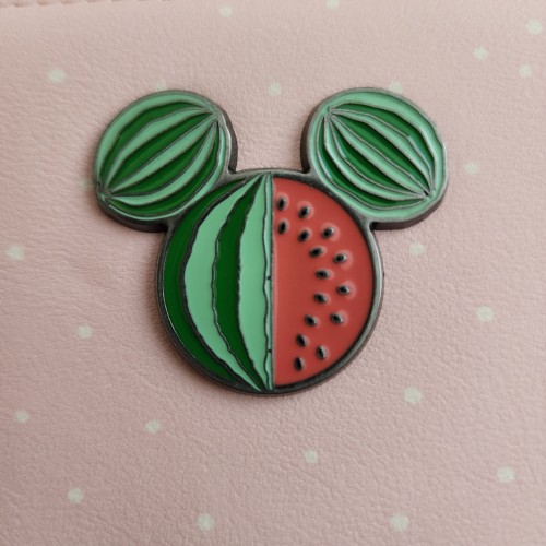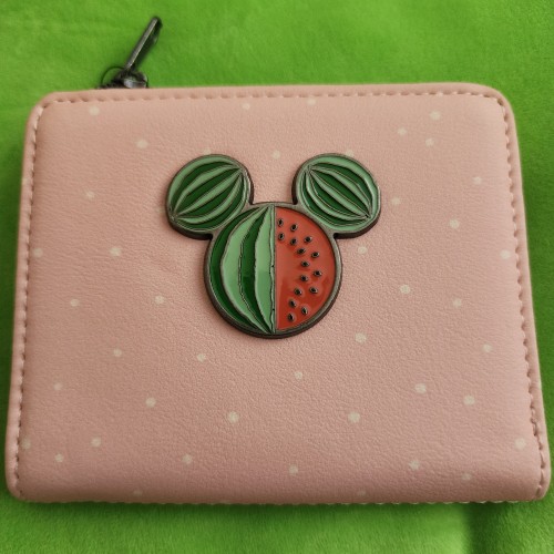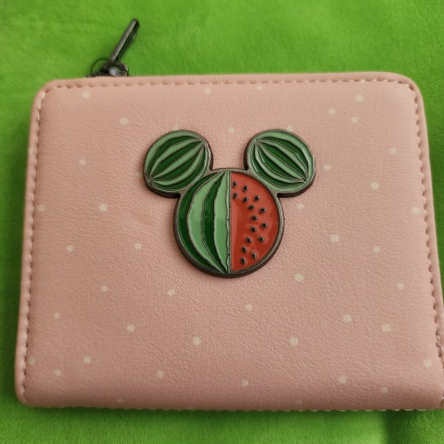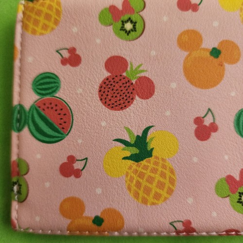 Awesome Loungefly Disney Mickey and Minnie Fruit Wallet. It has a snap closure with slots for credit cards, an ID slot, and a large side compartment for bills. Great gift for your loved one.