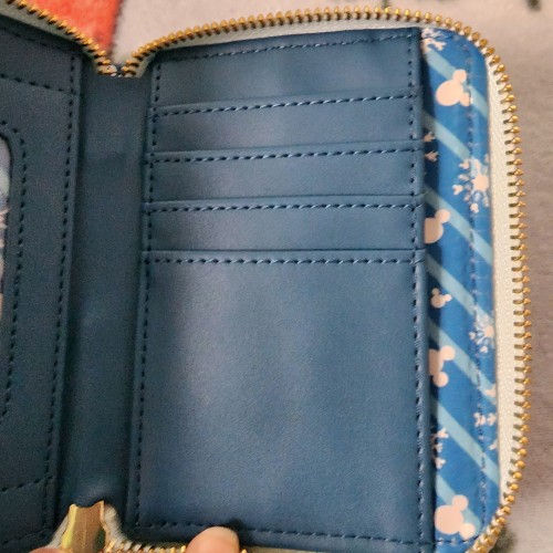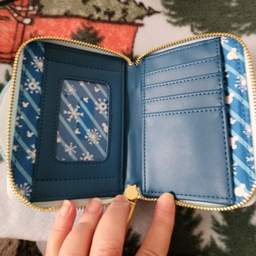 Super awesome Loungefly Disney Mickey and Minnie Mouse Snowman Snowglobe wallet. It has an all around zipper closure with slots for credit cards and a ID slot. There is a large slot for bills. Great for everyday use.