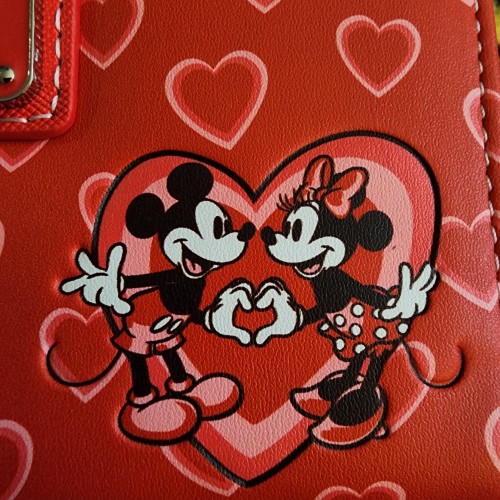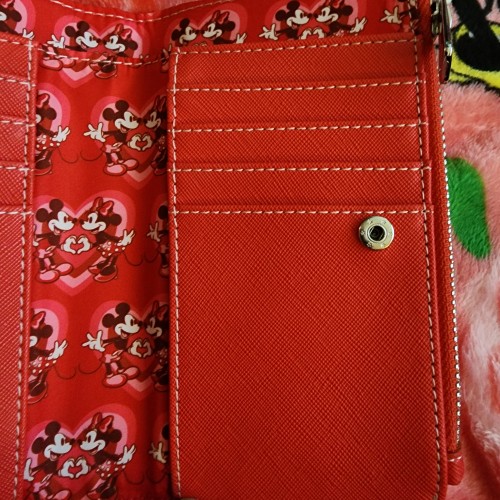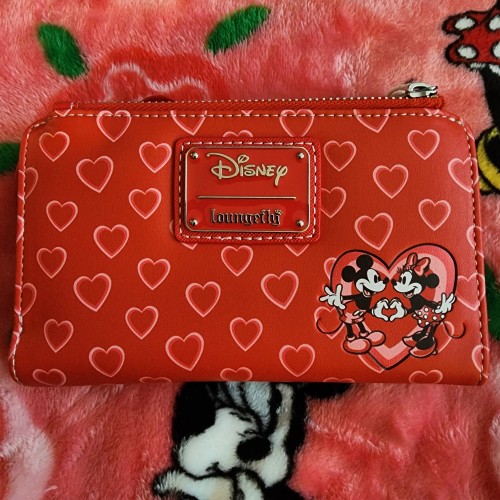 Loungefly Disney Mickey and Minnie Mouse Valentine’s Love Wallet. It has a snap closure with slots for credit cards and a ID slot. There is also a large slot for bills and a small zipper pocket for coins. On the front of the wallet it has Mickey ears, and a cute bow. There are hearts all over the wallet and Mickey and Minnie on the back froming a heart together with their hands. This is a great gift for the one you love.