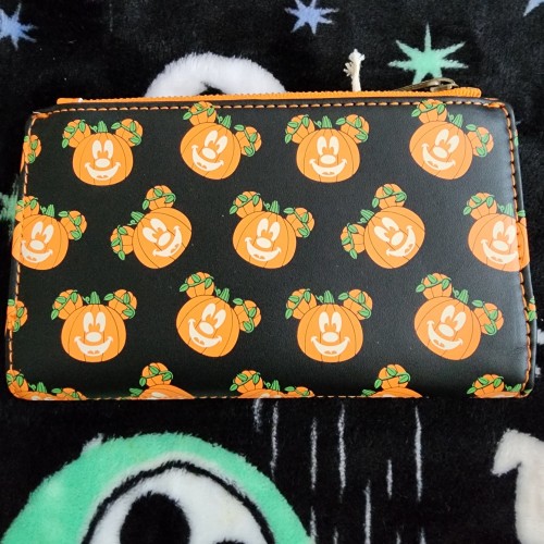Awesome Loungefly Disney Mickey Mouse Pumpkin Halloween Wallet. It has a snap closure with slots for credit cards and an ID slot. There is also a large slot on the side to hold bills. There is a side zipper pocket for coins and bills. This is great for everyday use or use for Halloween.