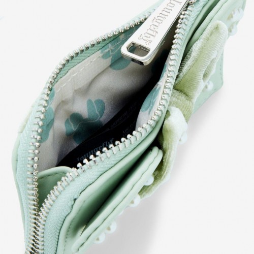 Add some stylish flair to your everyday look with this Disney cardholder! Featuring applique Minnie Mouse ears and a velvet bow, the front is covered in pearl accents. With a zippered side pocket and four card slots, this cardholder is perfect for any occasion. Don’t forget the matching mini backpack sold separately!