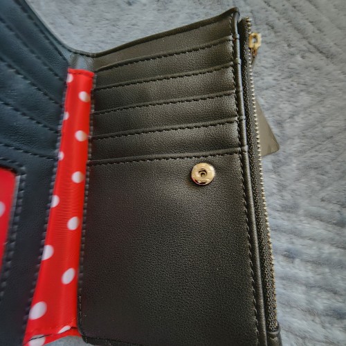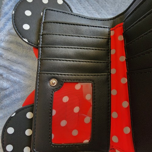 Disney Mickey and Minnie Mouse Polka Dots Wallet. With a snap closure, this wallet includes card slots, a clear ID sleeve, a bills compartment, and a perfect for your next adventure. Great for everyday use.
