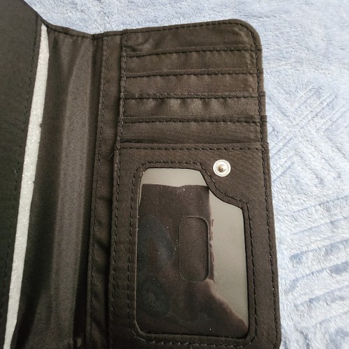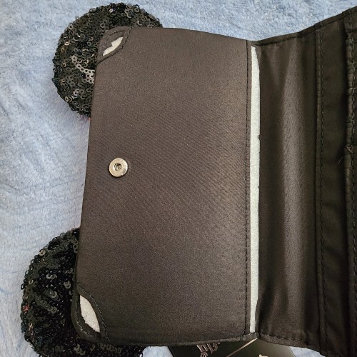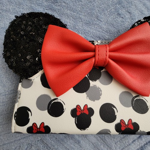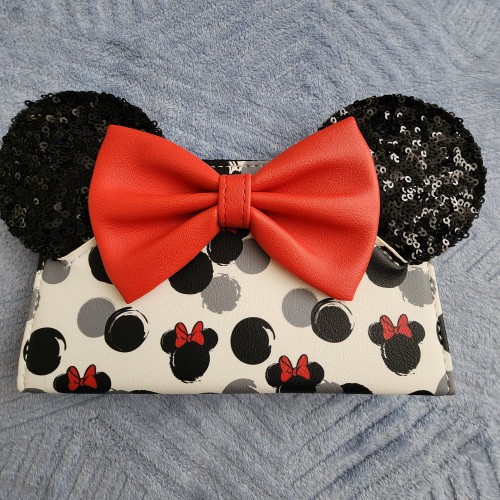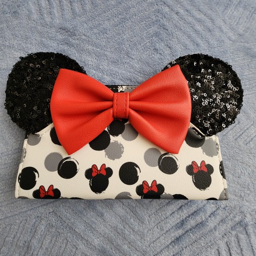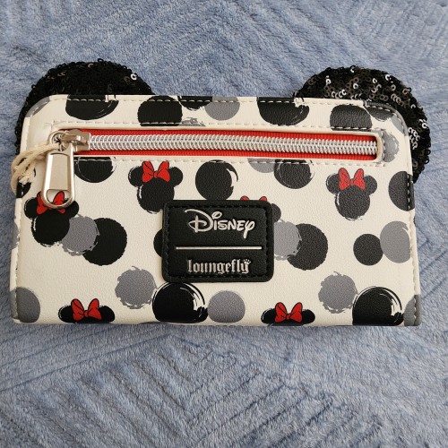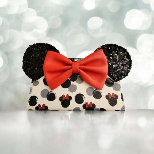 Our style icon, Minnie Mouse, approves of this accessory! This Loungefly snap wallet has an allover print of black and grey polka dots and Minnie Mouse’s head silhouette. It is topped with 3D sequined ears and a faux leather red bow. The back has a zippered pocket, and the inside has card and cash slots, plus clear ID display.