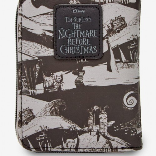 Creep around Halloween Town with your essentials stashed in this The Nightmare Before Christmas mini zipper wallet! Featuring an “RIP” tombstone with Jack Skellington peeking from behind, holding a jack-o’-lantern. The rest of the wallet highlights black & white sketches of Halloween Town. Comes with 5 card slots and a clear ID display. It even glows in the dark!