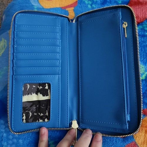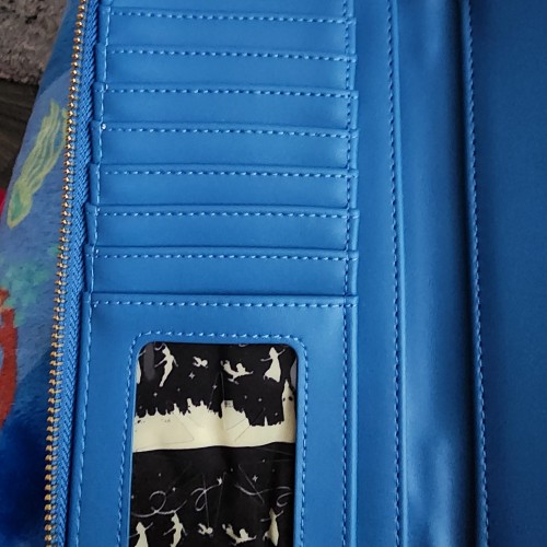 Awesome Loungefly Disney Peter Pan wallet. It has an all-around zipper closure with slots for credit cards and a ID slot. There is a zipper pocket for coins and a large slot for bills. The wallet also glows in the dark. Great for everyday use.