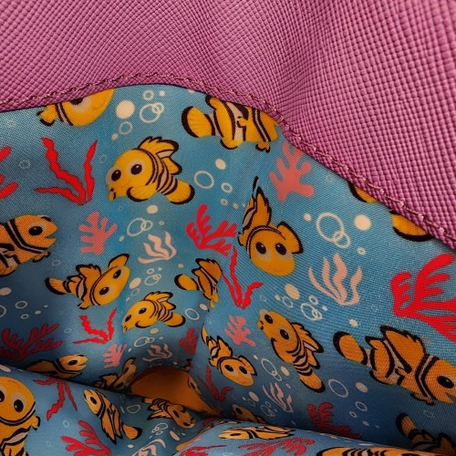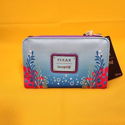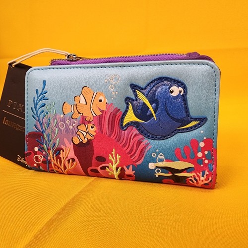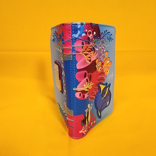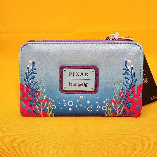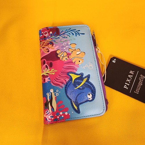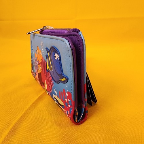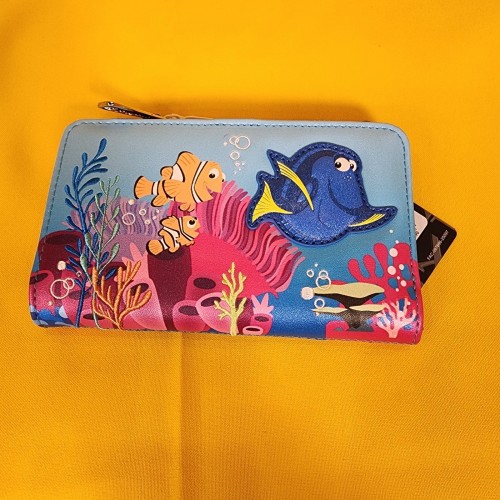 Just keep swimming! Featuring an applique of Dory, the front of this wallet includes printed details of Marlin and Nemo alongside embroidered coral and bubbles. With a snap closure and side zippered pouch, the interior of this wallet includes seven card slots, a clear ID sleeve, and a bills compartment to keep your essentials secure.