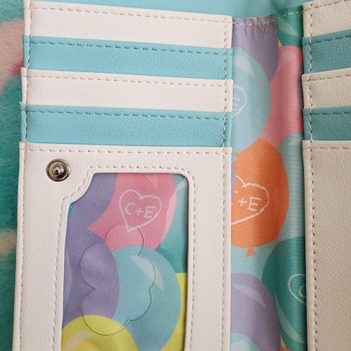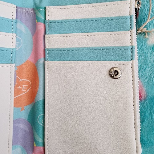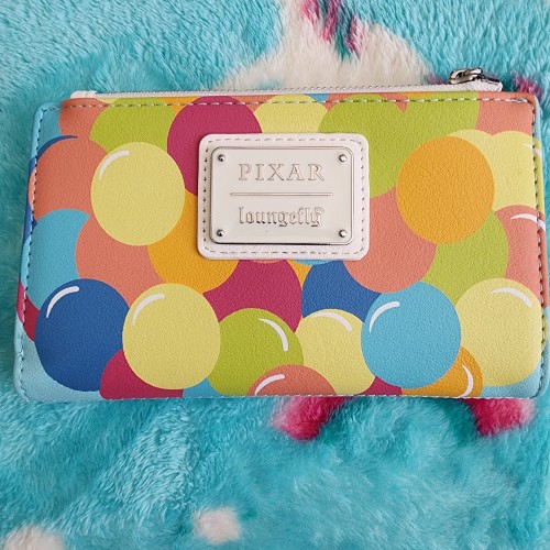 Awesome Loungefly Disney Pixar Up Wallet. It has a snap closure with slots for credit cards and an ID slot. There is a large slot for bills on the side of the wallet. There is a zipper compartment on the back of the wallet for coins. It is great for everyday use.