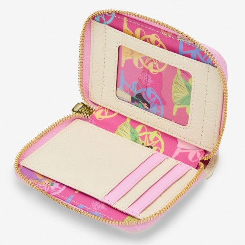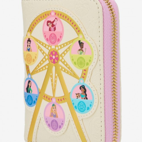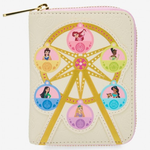 Add a royally fun touch to your accessories with this wallet! Featuring the Disney Princesses riding in a Ferris Wheel on the front, the body of the wallet is debossed with matching icons. Featuring four card slots and a clear ID sleeve, this wallet is perfect for a day at the Disney Parks or the carnival.