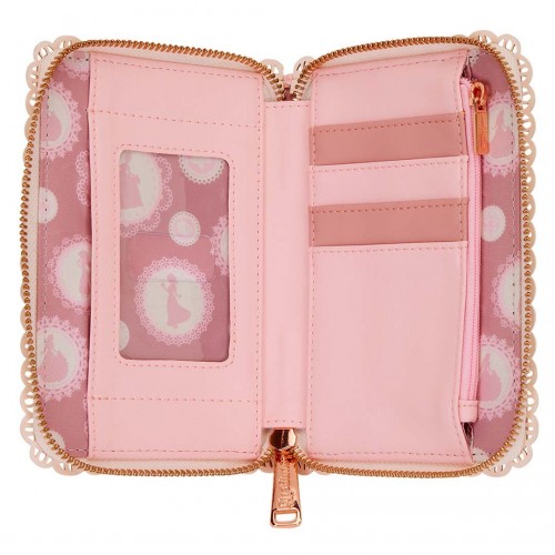 This wallet makes for the perfect princess piece to add to your ensemble. You’ll find the silhouettes of some of your favorite Disney Princesses on the front. 3D flowers and lace-like trim along the edge give an elegant feel. Inside, there are four card slots and one clear slot for an ID.