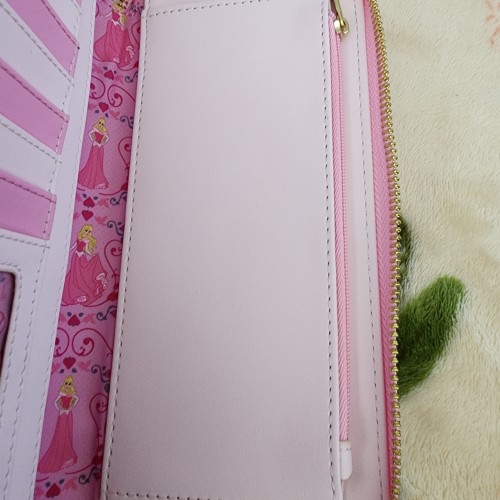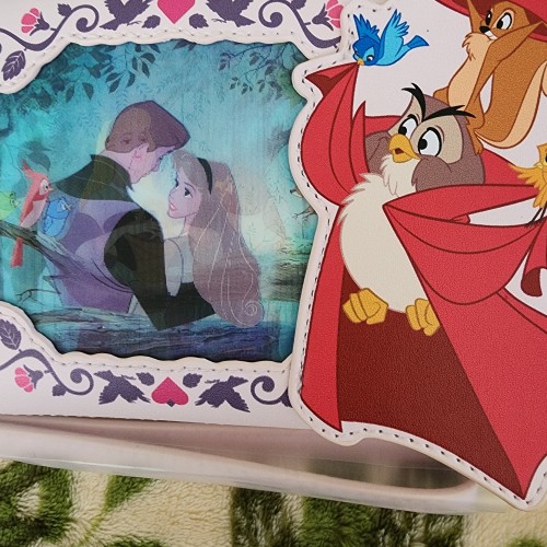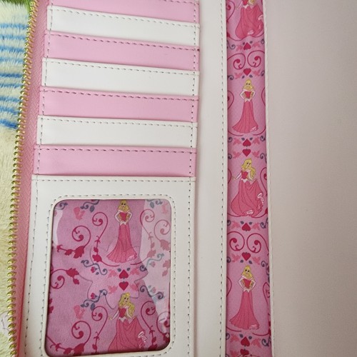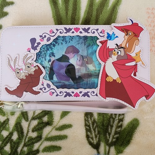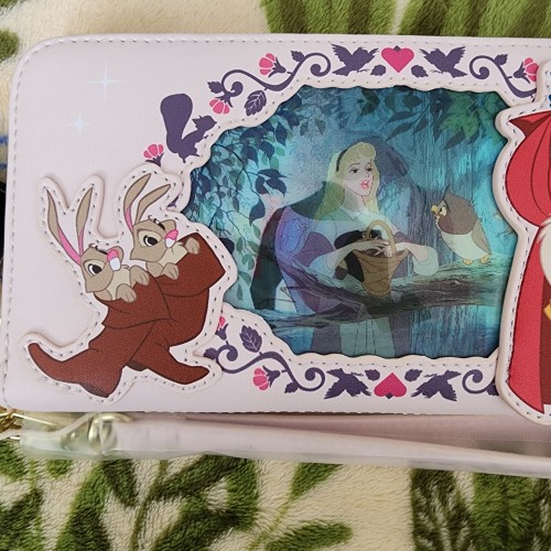 Awesome Loungefly Disney Sleeping Beauty 65th Anniversary Holographic Wallet. This wallet has zipper all-around closure with slots for credit cards and an ID slot. It comes with a wristlet to carry it by. This wallet has a holographic portrait in the middle, front of the wallet that, when moved, changes to 2 different pictures. This wallet is great for everyday use