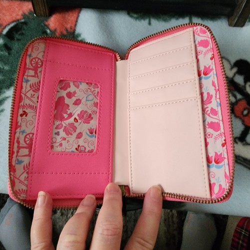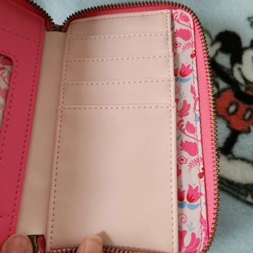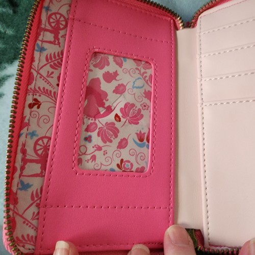 Awesome Loungefly Disney Sleeping Beauty wallet. It is exclusive and hard to find. It has an all around zipper closure with slots for credit cards and a ID slot. There is a slot for bills