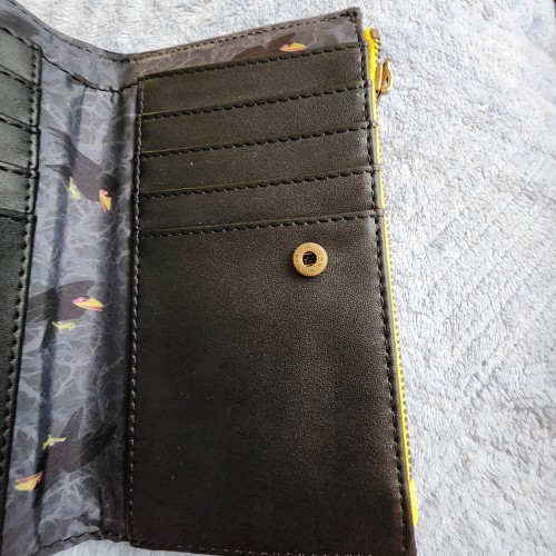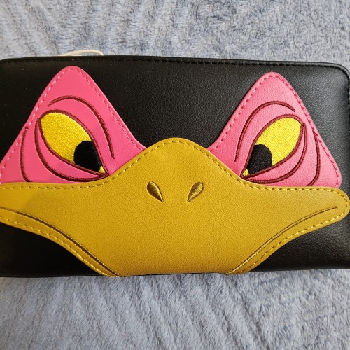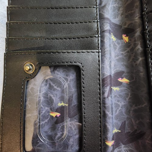 Awesome Loungefly Disney Sleeping Beauty Diable Wallet. It has a snap closure with slots for credit cards and a ID slot. There is also a large slot for bills and a zipper pocket for coins.