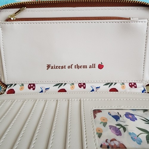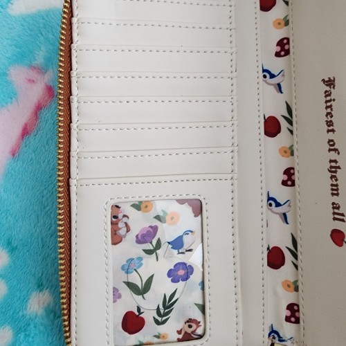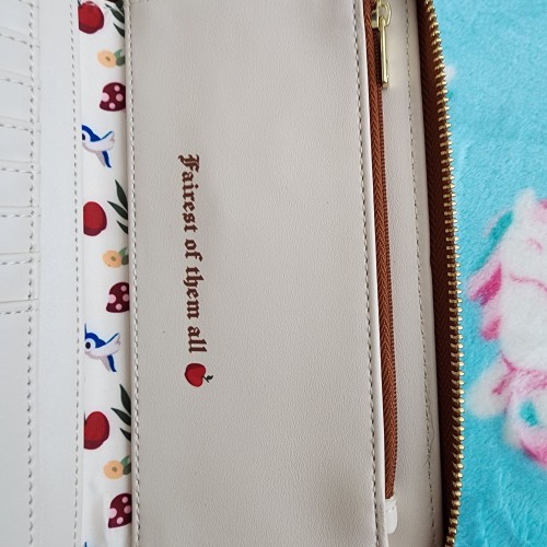 Awesome Loungefly Disney Snow White Wallet. It says ” Fairest Of Them All” It has a all around zipper closure with slots for credit cards and an ID slot. It is great for everyday use.