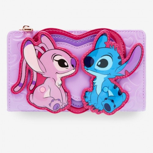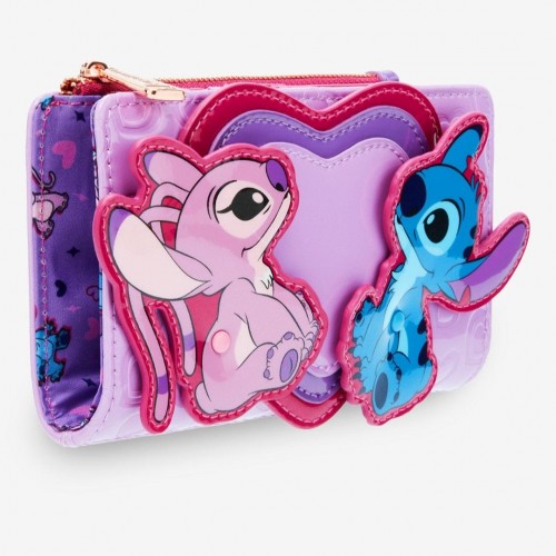 Spread the love with this Lilo & Stitch wallet! Featuring an allover design of debossed hearts, the front includes an applique heart with moving appliques of Angel and Stitch. With a snap closure, this wallet includes seven card slots, a clear ID sleeve, a bills compartment, and a zippered side pouch, perfect for your next adventure. Don’t forget the matching mini backpack sold separately!