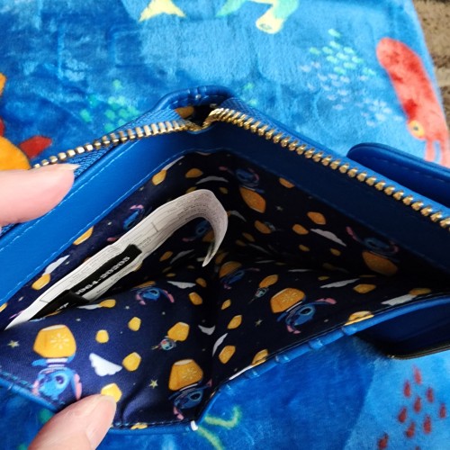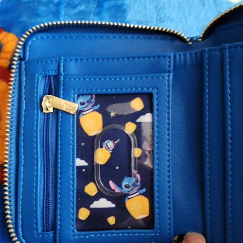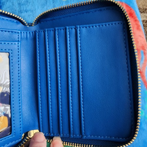 Awesome Loungefly Disney Stitch and Scrump Wallet. It has an all around zipper closure with slots for credit cards and a ID slot. There is also a zipper compartment for coins and a slot for bills.There is a little snap pocket in the front of the wallet. It great for everyday use.