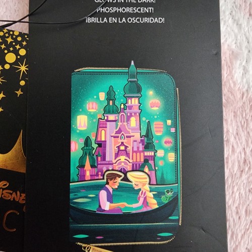 Awesome Loungefly Disney Tangled Rapunzel and Flynn Castle Collection Wallet. The wallet has Rapunzel and Flynn on the front watching the lanterns. It has slots for credit cards and an ID slot. There is a small slot you can put bills in. This is a great gift for your loved one.