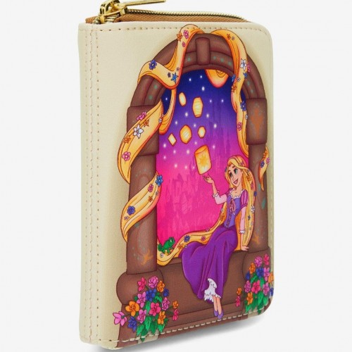 Off to see the floating lanterns? Pack your essentials into this Tangled mini zipper wallet! Featuring Rapunzel perched at a window with her hair wrapped all along, plus Corona’s castle outside with gloating lanterns all over. Comes with 4 card slots, clear ID slot and zipper closure.