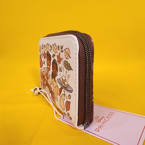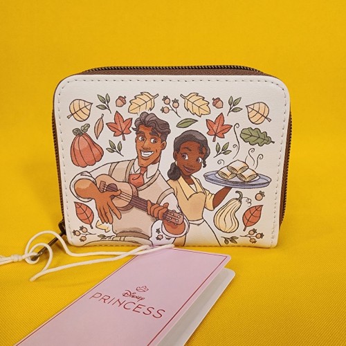 Tiana and Naveen from The Princess and the Frog are ready for fall! This cute mini zip wallet shows a portrait of the two characters surrounded by fall gourds and leaves. Tiana is holding hot beignets and Naveen is playing guitar. The other side shows an allover print of fall leaves, gourds and cooking equipment. Inside, there are card and cash slots, plus a clear ID display.