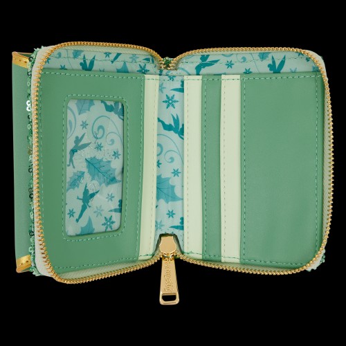 Add a little bit of Disney Tinker Bell flair to your day! This Loungefly wallet features a metal charm of Tinker Bell on the front. Around her are swirling designs and leaves. You’ll also find sequin details on this wallet! Inside, there are five card slots and one clear slot for an ID. Soar off in super cute Disney style with this wallet!