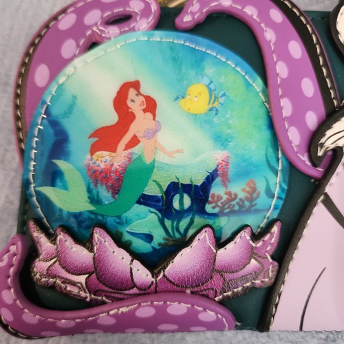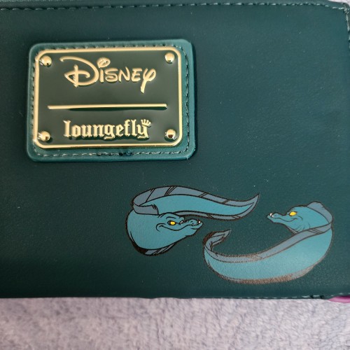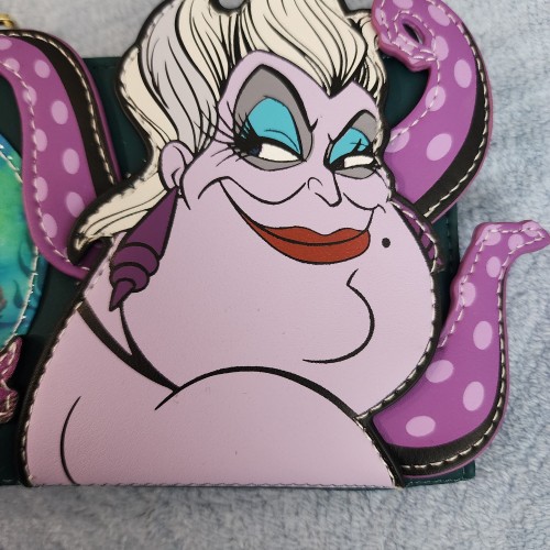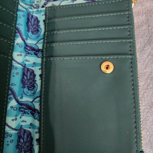 Awesome Loungefly Disney Ursula Little Mermaid Wallet. It has a snap closure. There are slots for credit cards, an ID slot, and a large bill slot. There is also a zipper compartment on the back of the wallet. This wallet is great for every day.