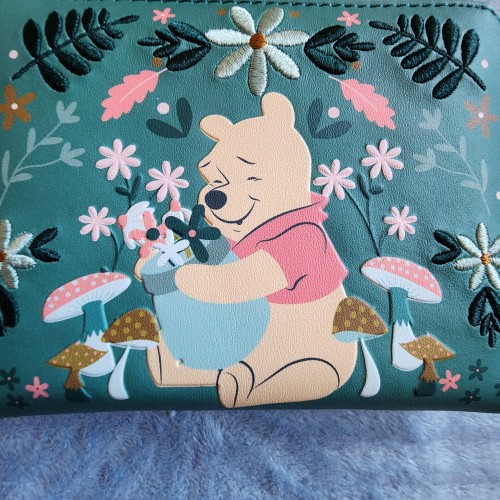 Awesome Loungefly Disney Winnie the Pooh and Friends Folk Art Wallet. It has a zipper a round closure with slots for credit cards and an ID slot. There flowers are embroideried on. Great for everyday use.