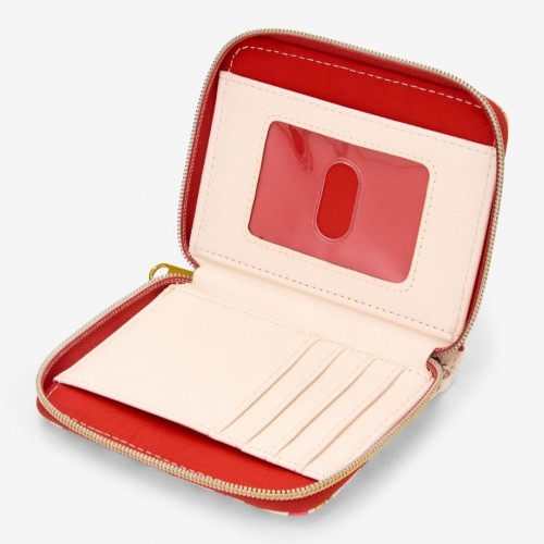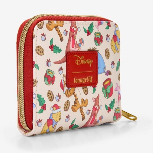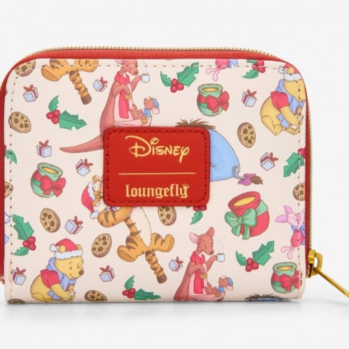 The Hundred Acre Wood gang has gathered for the holidays, and they want milk and cookies! This mini zip wallet is decorated with a festive allover print of Pooh, Tigger, Eeyore, Kanga, Roo and Piglet in Santa gear, gifts, cookies, hunny pots, holly and milk. The interior has card and cash slots plus clear ID display.